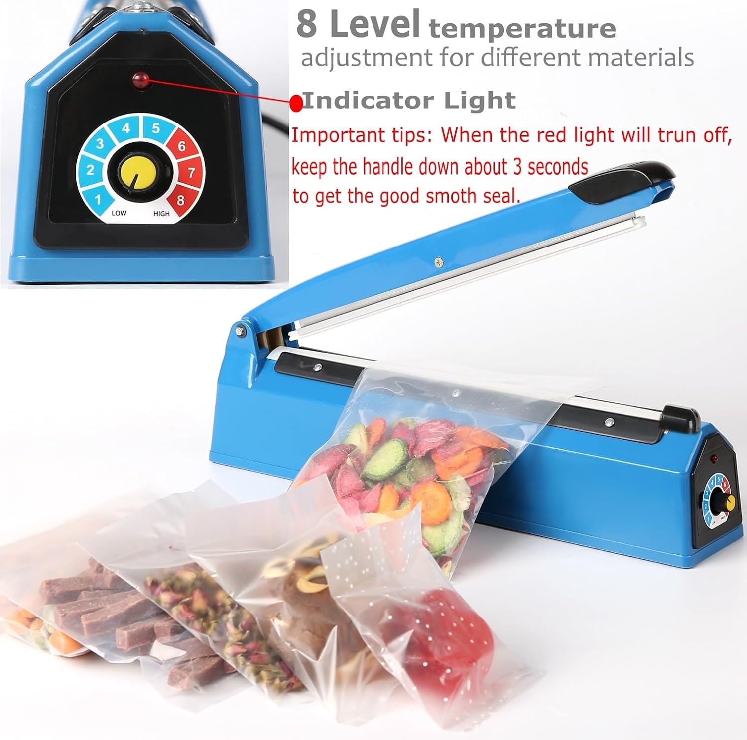 - 12 inch Tabletop Impulse Heat Sealer -Instantly use, No warm up time needed, Lightweight Design.8 stalls temperature adjust impulse manual hand bag sealer to meet any any different types of plastic packaging bags.