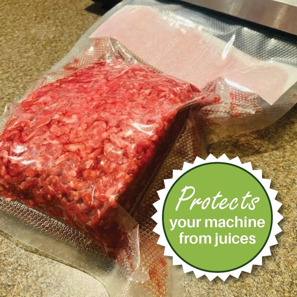 - LIQUID BLOCK: Features an absorbent cellulose moisture barrier strip to stop juices from leaking into your vacuum sealer machine